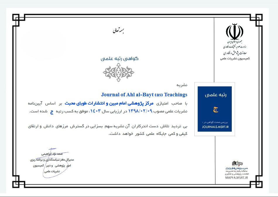 2025-10-23انتشار توسط امام مبین در 2025-10-23دسته بندی اخبار و مقالات فعالیتهای پژوهشیاخذ رتبه علمی پژوهشی مجله Journal of Ahl al-Bayt (as) Teachings از وزارت علوم، تحقیقات و فناوریاخذ رتبه علمی پژوهشی مجله Journal of Ahl al-Bayt (as) Teachings از وزارت علوم، تحقیقات و فناوری با صاحب امتیازی مرکز پژوهشی امام مبین